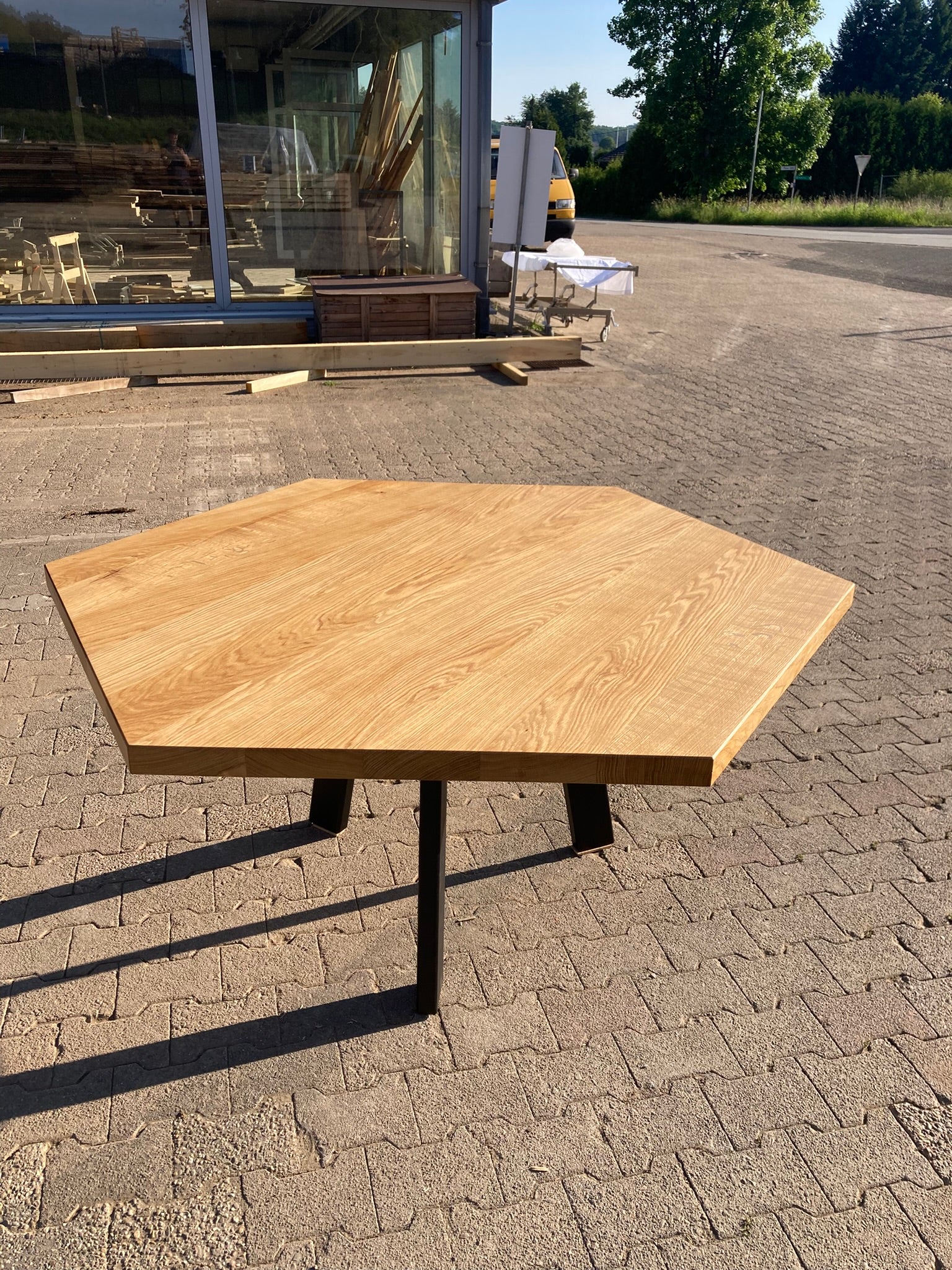 Ein sechseckiger Esstisch nach Vorgabe des Kunden. Die Form passt perfekt zu einer bestehenden Nische im Esszimmer. Gefertigt aus Massiver Eiche mit einer geölten Oberfläche. Das Gestell haben wir in unserer Metallwerkstatt aus Stahl hergetsllt und schwarz lackiert.