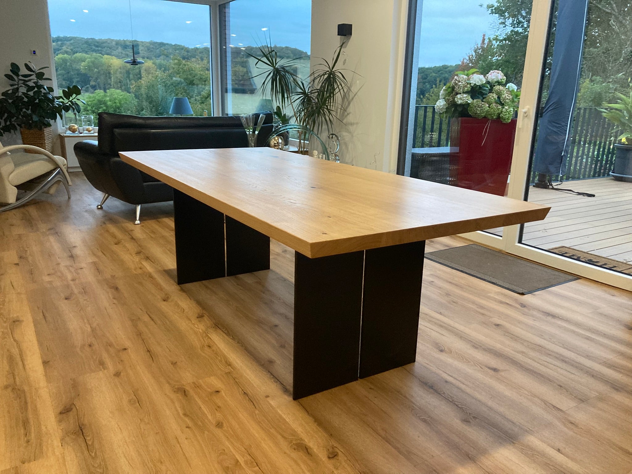 Dieser Esstisch wurde gnau nach Kundenwunsch angefertigt. Die Kanten sind leicht shcräg geschnitten un. Das Wangengestell aus 10 mm dickem Stahl ist schwarz pulverbeschichtet.